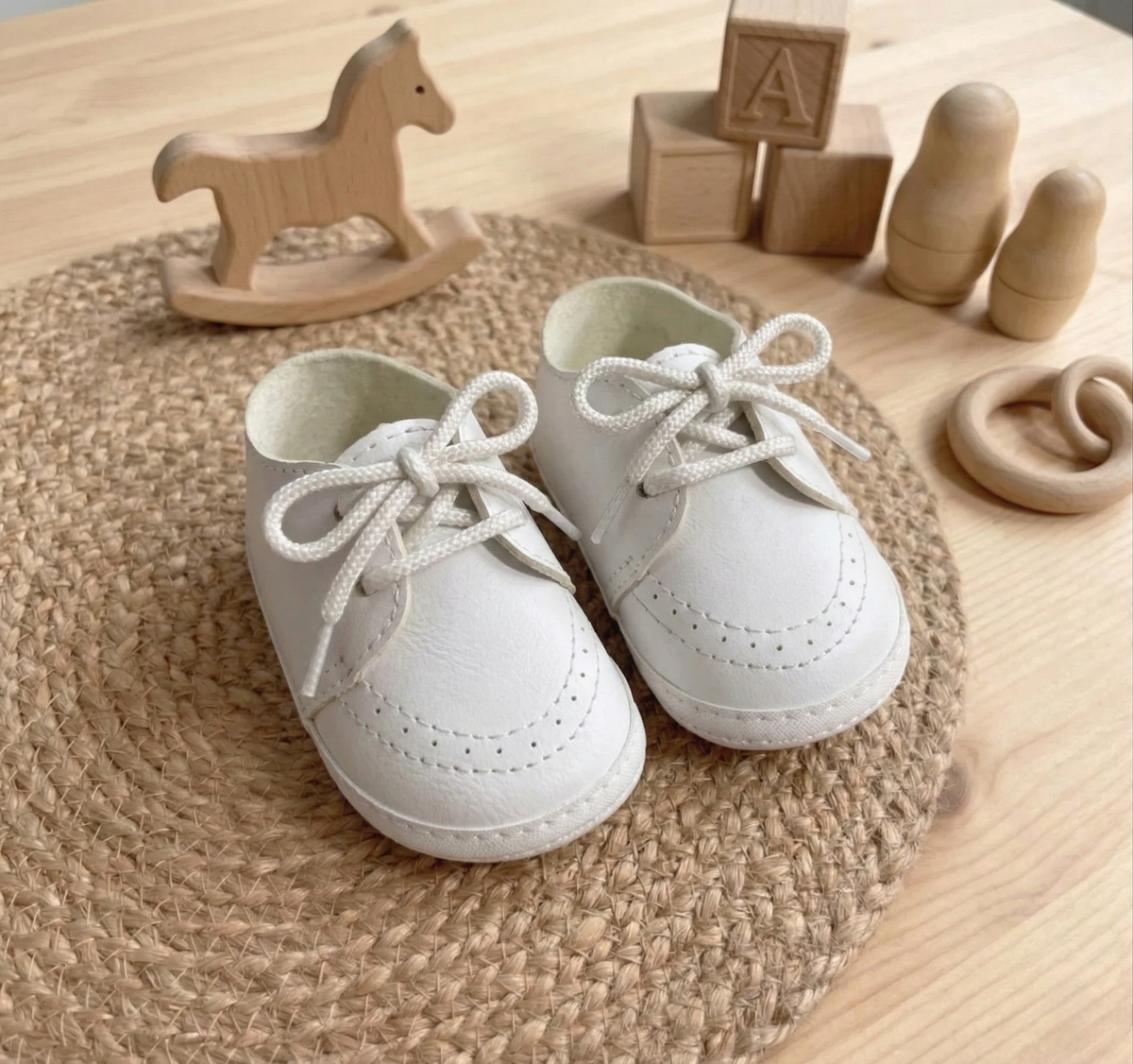 Zapatito blanco no caminante confeccionado en eco cuero. Forrado por dentro con materiales antitranspirantes y blanditoa para la comodidad de tu bebito.