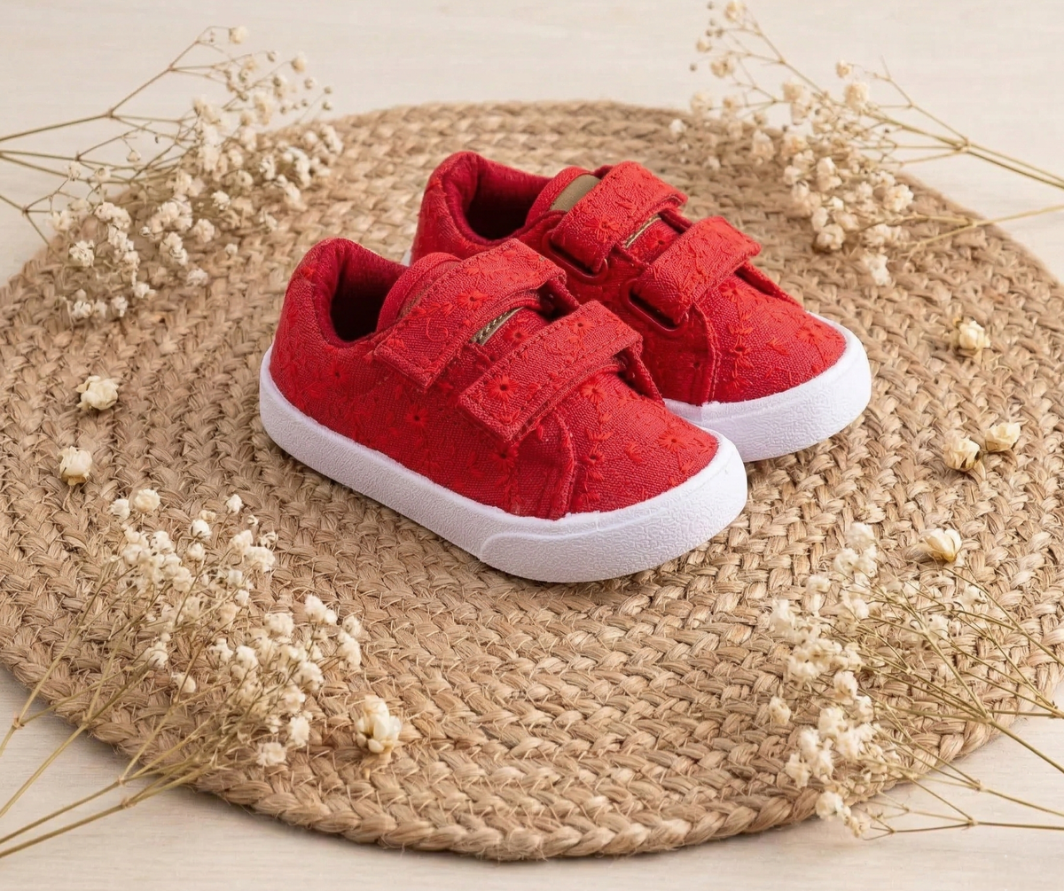 Zapatilla confeccionada en lona broderie con ajuste de doble velcro para mayor facilidad.
